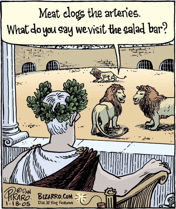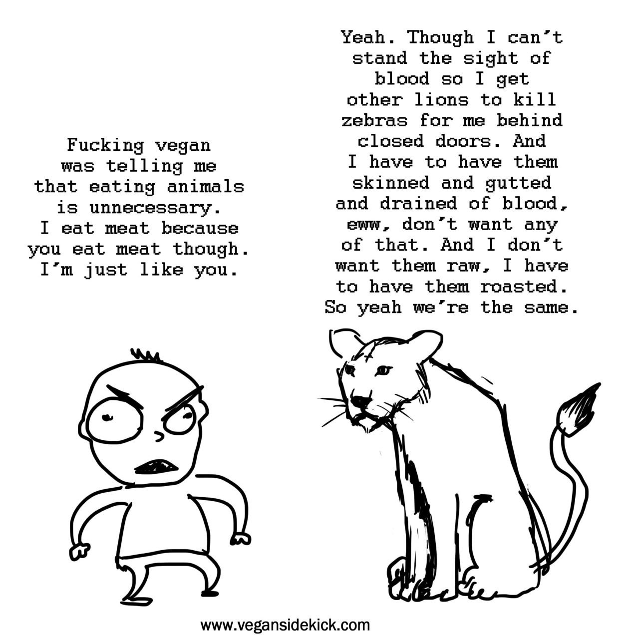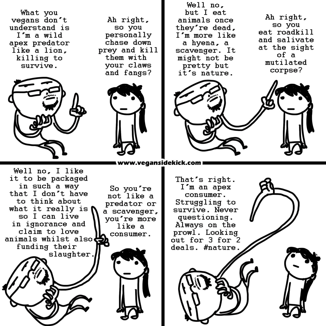 The argument for modeling human behavior on non-human behavior is unclear to begin with, but if we're going to make it, why shouldn't we choose to follow the example of the hippopotamus, ox or giraffe rather than the shark, cheetah or bear? Why not compare ourselves to crows and eat raw carrion by the side of the road? Why not compare ourselves to dung beetles and eat little balls of dried feces? Because it turns out humans really are a special case in the animal kingdom, that's why. So are vultures, goats, elephants and crickets. Each is an individual species with individual needs and capacities for choice. Of course, humans are capable of higher reasoning, but this should only make us more sensitive to the morality of our behavior toward non-human animals. And while we are capable of killing and eating them, it isn't necessary for our survival. We aren't lions, and we know that we cannot justify taking the life of a sentient being for no better reason than our personal dietary preferences.