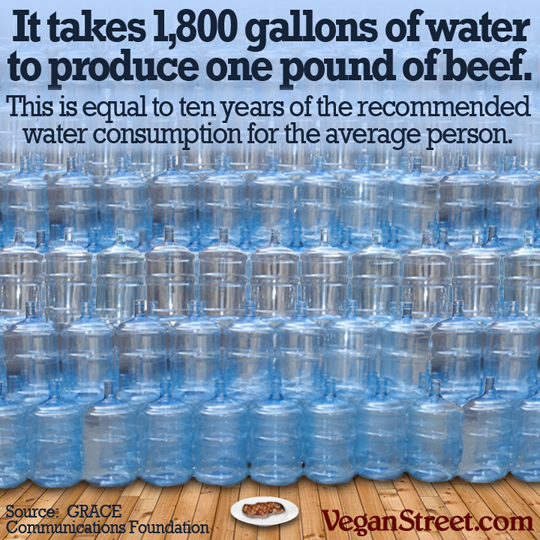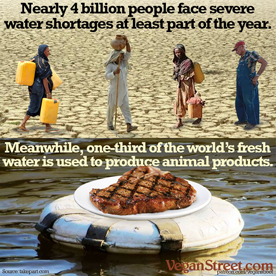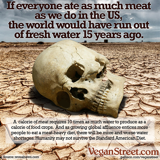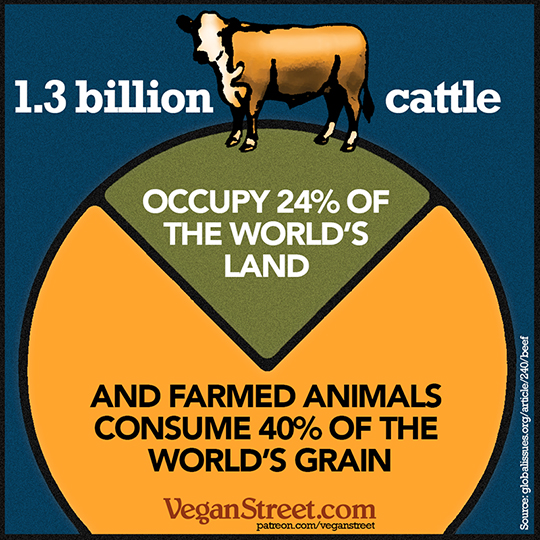 In all, roughly 40% of the world's arable land is used for food production, while only a quarter of that food is for human consumption. The rest, a staggering 30% of the world's arable land, is used to produce animal feed and commands a third of the world's fresh water. Worse, the meat resulting from this industrialized animal agriculture is not divided evenly. For instance, Americans eat 270 lbs of meat a year on average, while Bangladeshis eat 4 lbs. If the entire world were to eat as much meat as Americans do, the global land required would be 75% more than is already used, a number so high the Earth would have to be quite a bit larger to support it. Meanwhile, much of the world gets no food at all or raises livestock feed for export to countries with a high demand for meat, creating an unequal burden of production versus consumption between the poorest and richest people on the planet.