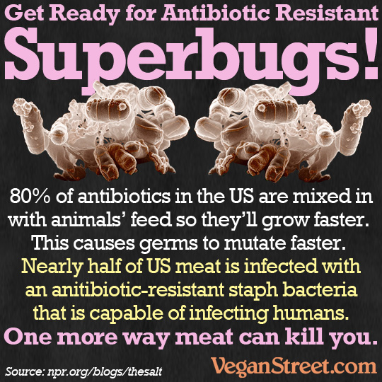 Worse, people who do not eat animals are placed at grave risk by people who do. In many developed countries, factory-farmed animals are fed antibiotics in sub-therapeutic doses to counteract suboptimal growth caused by unsanitary conditions. In this way, factory farms are exposing zoonotic diseases to non-toxic levels of these drugs, and this is driving the growth of antibiotic resistant bacteria. Many of our “last-resort” antibiotics are being used this way in animal agriculture, and a substantial percentage of all antibiotics are given to food animals. As a result, we are near the dawn of a post-antibiotic era; a terrifying consequence of animal agriculture we might very well see in our own lifetimes.