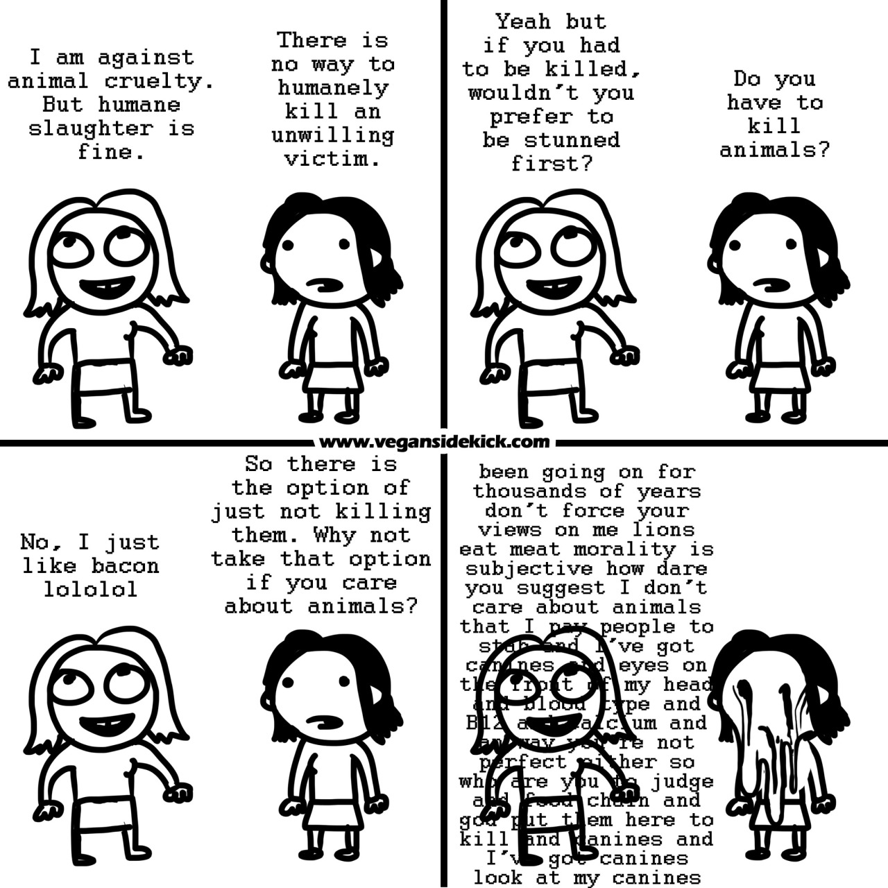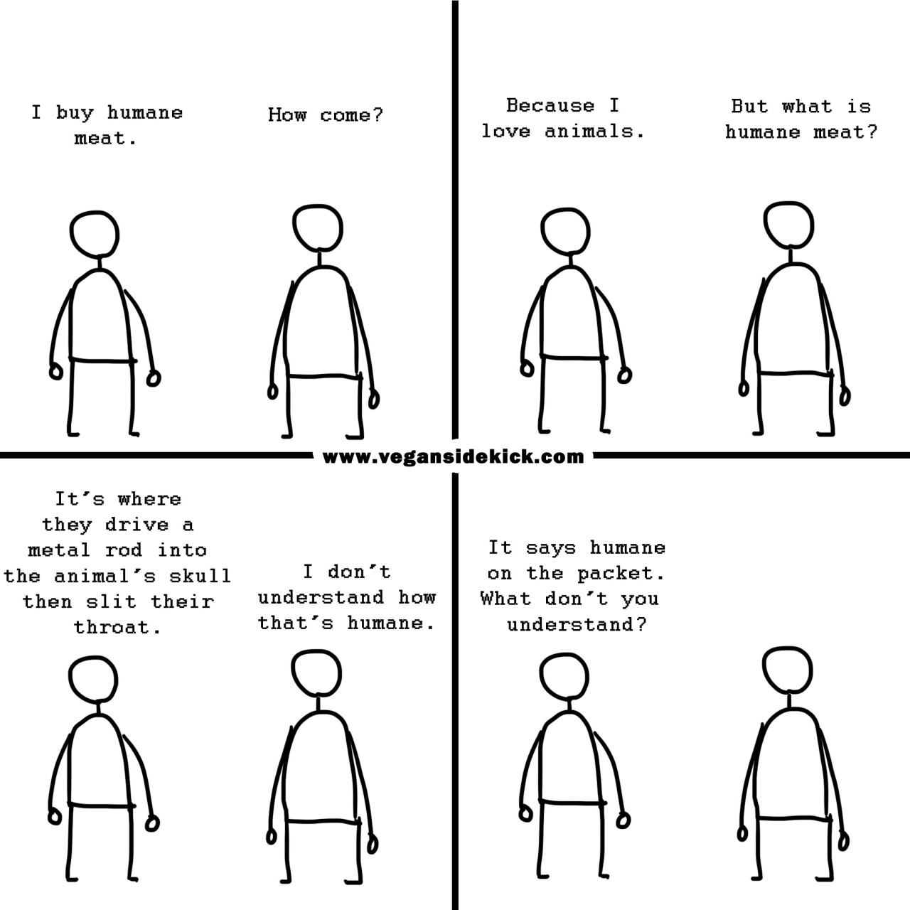 Killing animals for food is far worse than making them suffer. Of course, it is admirable that people care so deeply about these animals that they take deliberate steps to reduce their suffering (e.g. by purchasing "free-range" eggs or "suffering free" meat). However, because they choose not to acknowledge the right of those same animals to live out their natural lives, and because slaughtering them is a much greater violation than mistreatment, people who eat 'humane' meat are laboring under an irreconcilable contradiction.