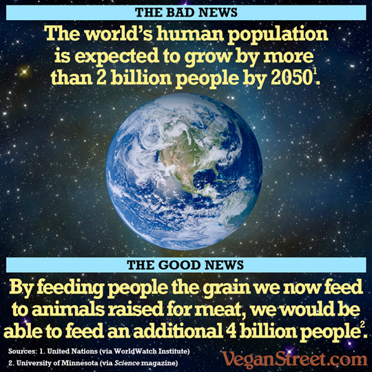 Food scarcity is an argument for veganism, not against it. As the world’s population grows and more people are able to afford meat, less food is available overall. This is because we filter protein and energy-rich crops like soy and grain through animals at a substantial loss before eating them. Depending on the numbers you want to trust and the type of animal it comes from, each pound of meat requires four to thirteen pounds of feed to produce. By switching to a plant-based diet, the farms that presently grow that feed are able to grow food for people instead.