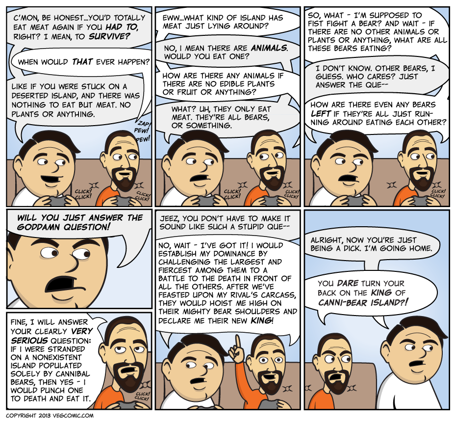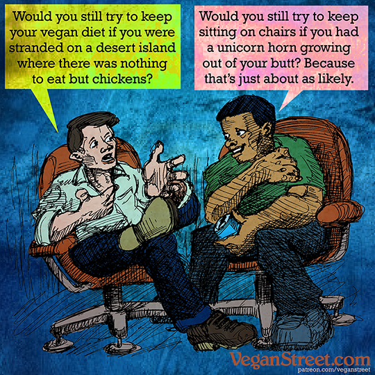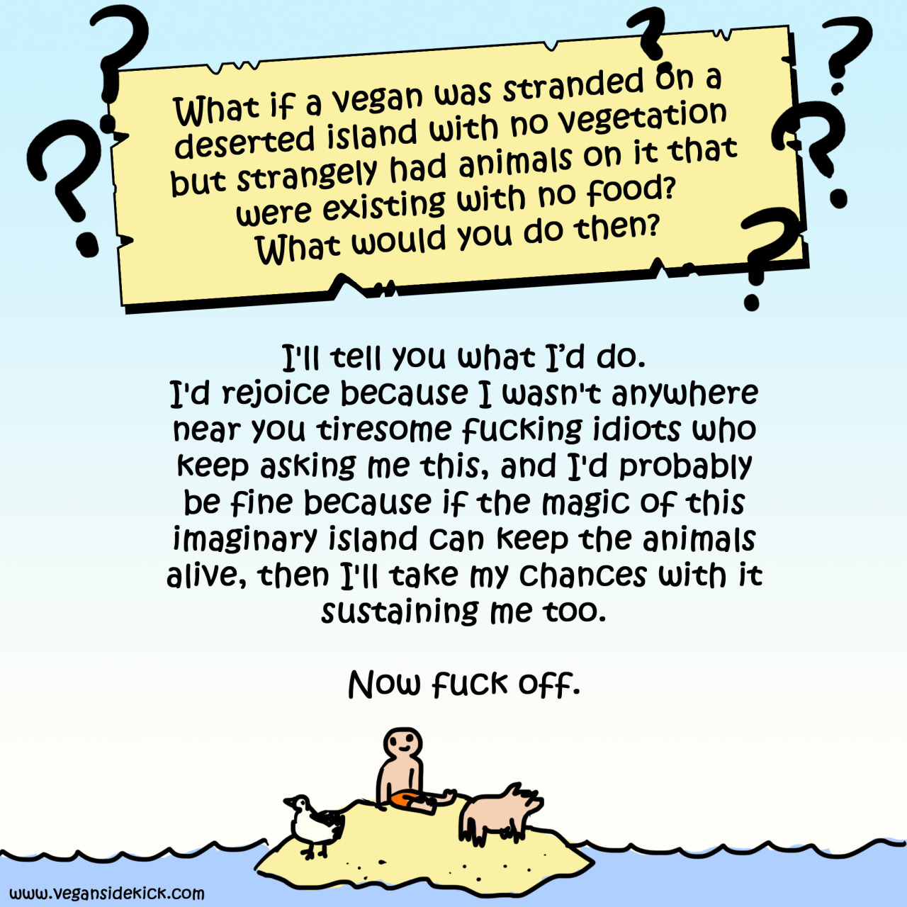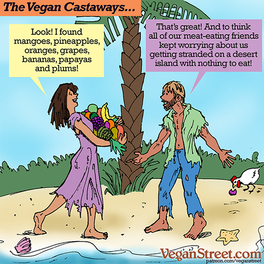 As vegans, we are commonly asked the “deserted island” question. “Sure, you’re vegan, but what if you were stranded on a desert island…what would you eat then?” The simple answer is, “Whatever plants the animals are eating.” To take this a step further, I’d like to pose that those same people answer this question: if a toddler was placed on an uncharted island with abundant wildlife and plant life, would the child grow up a vegan or a meat-eater?