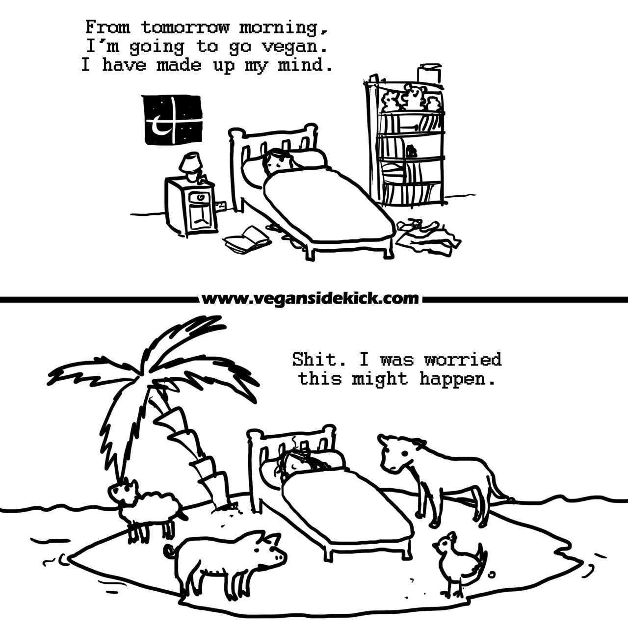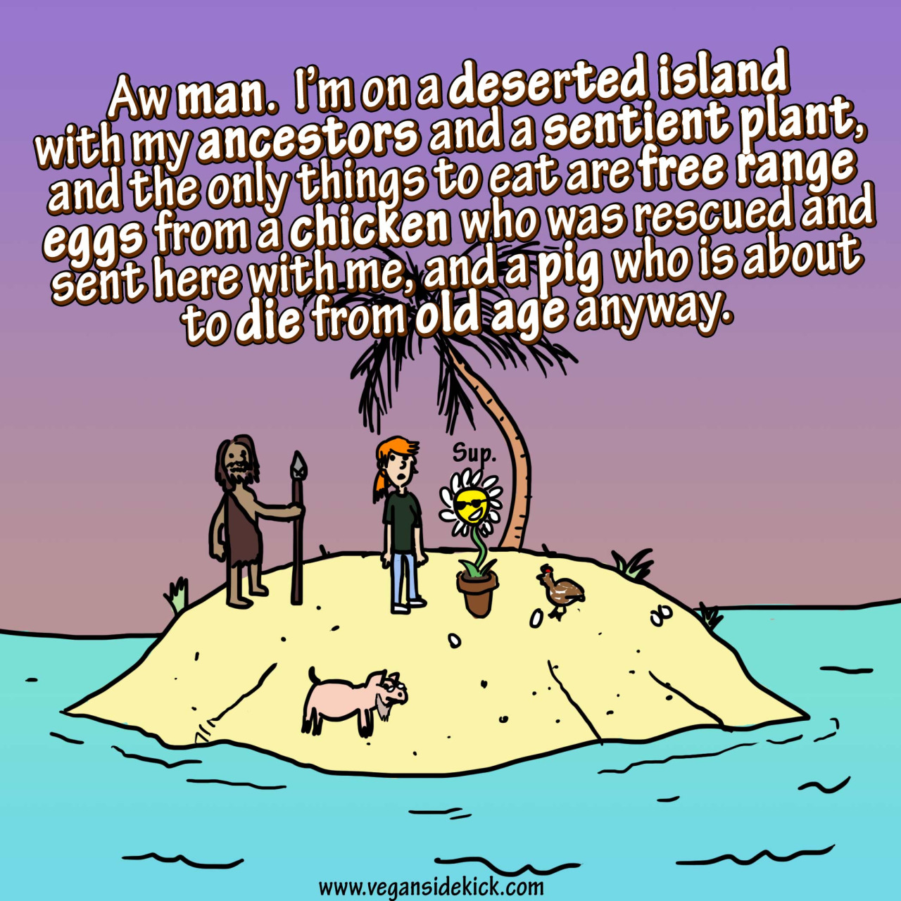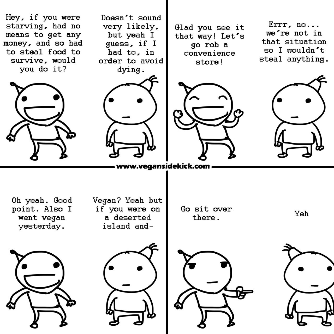 This argument proposes a hypothetical edge-case scenario (i.e. eating animals on a desert island) as a means of justifying a real-life behaviour (i.e. eating animals on a daily basis). However, this exercise in imagination does not represent a plausible situation people might find themselves in and does not tell us anything about the morality of the vegan addressing the topic. For these reasons, it tends not to be a productive conversation point.