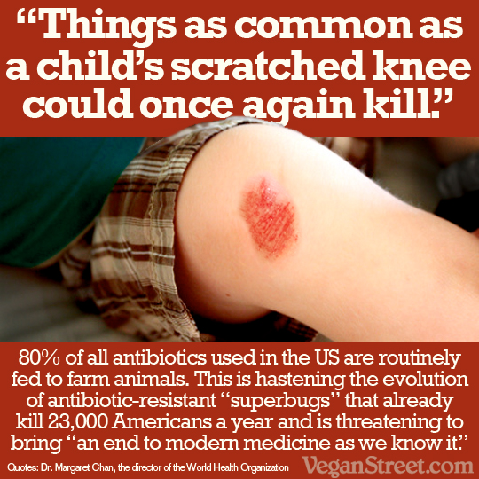 Worse, people who do not eat animals are placed at grave risk by people who do. In many developed countries, factory-farmed animals are fed antibiotics in sub-therapeutic doses to counteract suboptimal growth caused by unsanitary conditions. In this way, factory farms are exposing zoonotic diseases to non-toxic levels of these drugs, and this is driving the growth of antibiotic resistant bacteria. Many of our “last-resort” antibiotics are being used this way in animal agriculture, and a substantial percentage of all antibiotics are given to food animals. As a result, we are near the dawn of a post-antibiotic era; a terrifying consequence of animal agriculture we might very well see in our own lifetimes.