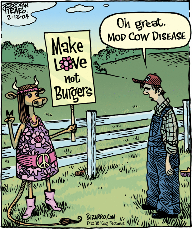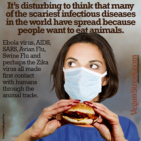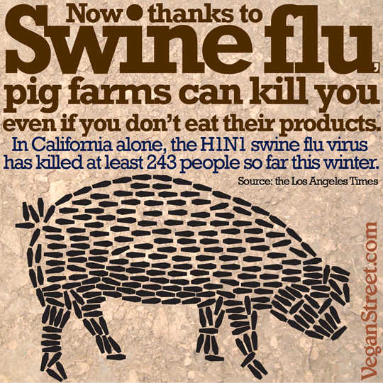 Many human diseases come directly from animals. For instance, pigs and birds carry influenza, pigs and dogs carry whooping cough, and cows carry tuberculosis, smallpox, and cowpox. So when we raise and eat animals, we increase our risk of exposure to these and other diseases. Further, plants contaminated by animal agribusiness runoff can be vectors of salmonella, which is the primary way spinach, peanut butter, and other plant-based foods come into contact with the bacteria.