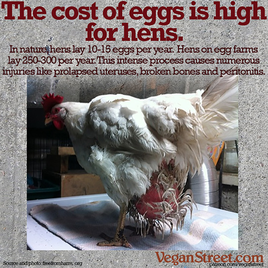 The hens that lay eggs go through "forced molting", which translates as giving her no feed for seven to fourteen days at a stretch, causing her reproductive cycle to reset. They are forced to undergo this process several times during their life, which is cut dreadfully short; she will live two years or less, until her body is exhausted from the stresses of constant laying and her egg production decreases. When you consider that she would live to be eight to ten years if left to her own devices, she is essentially killed as teenager.