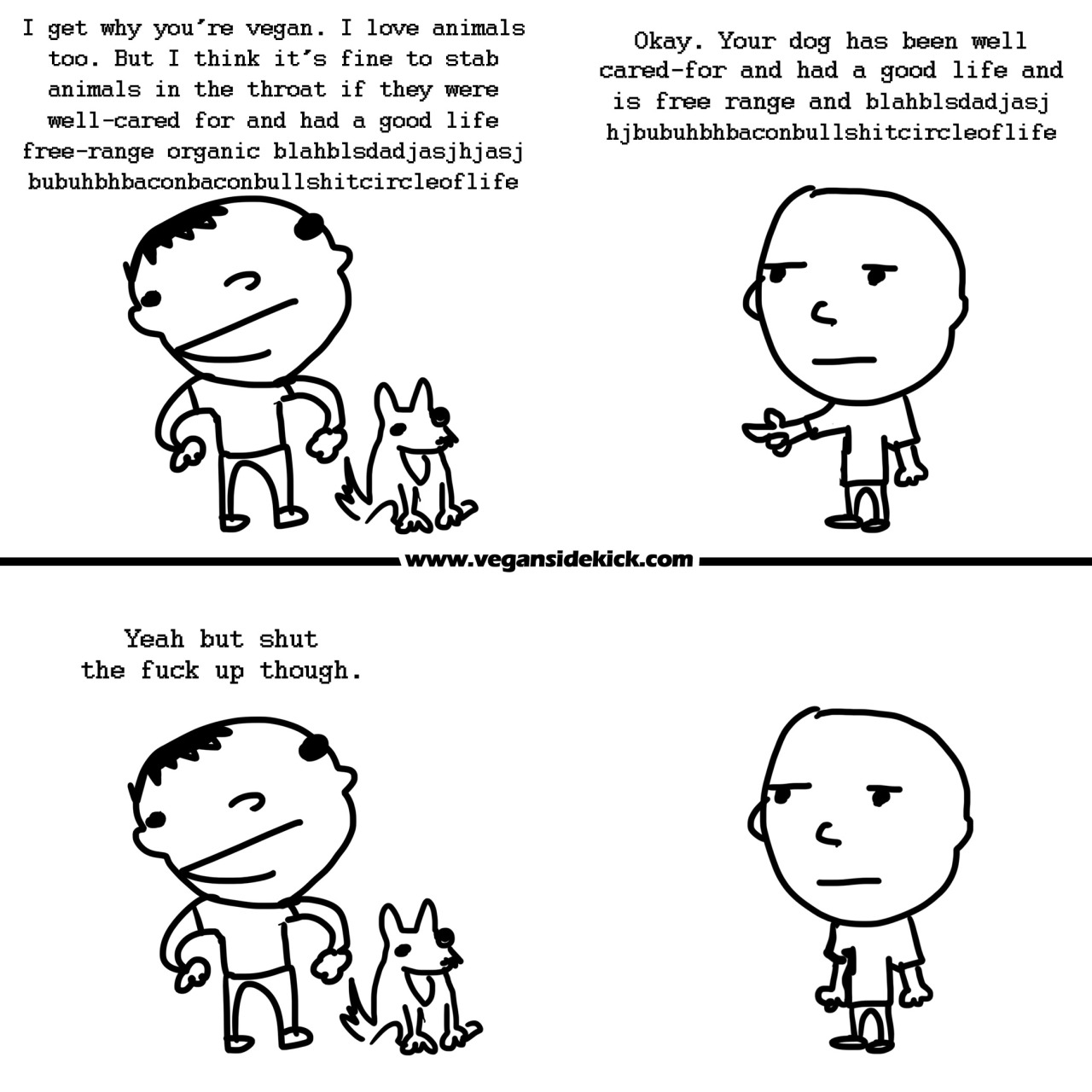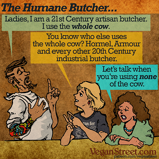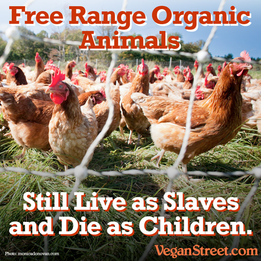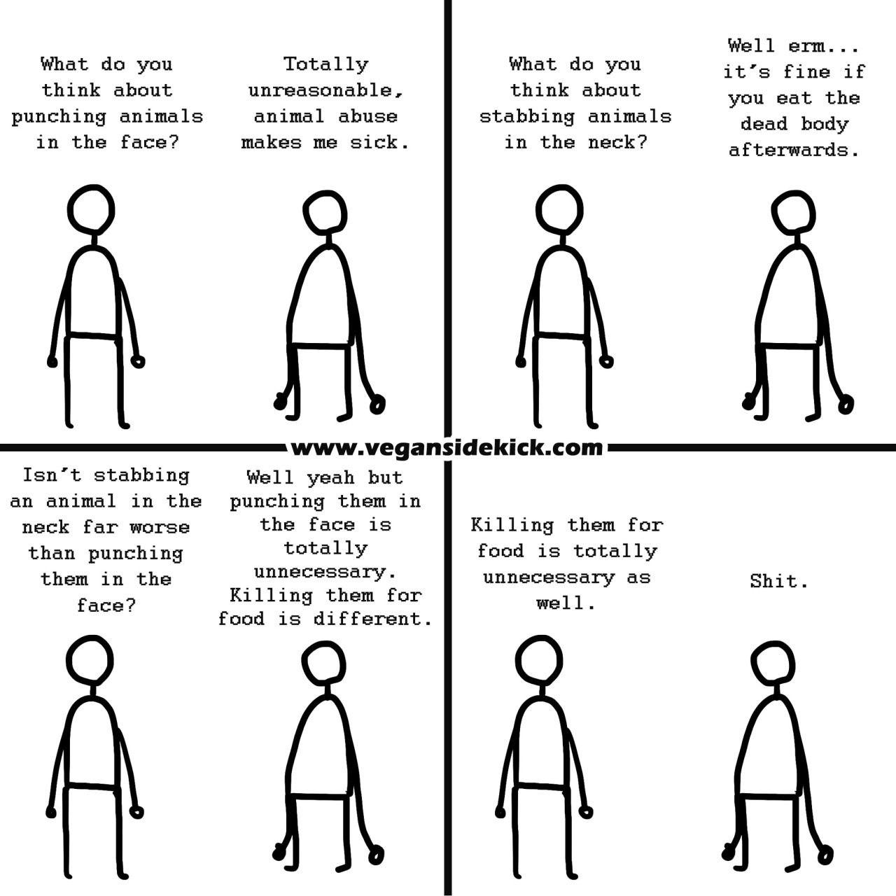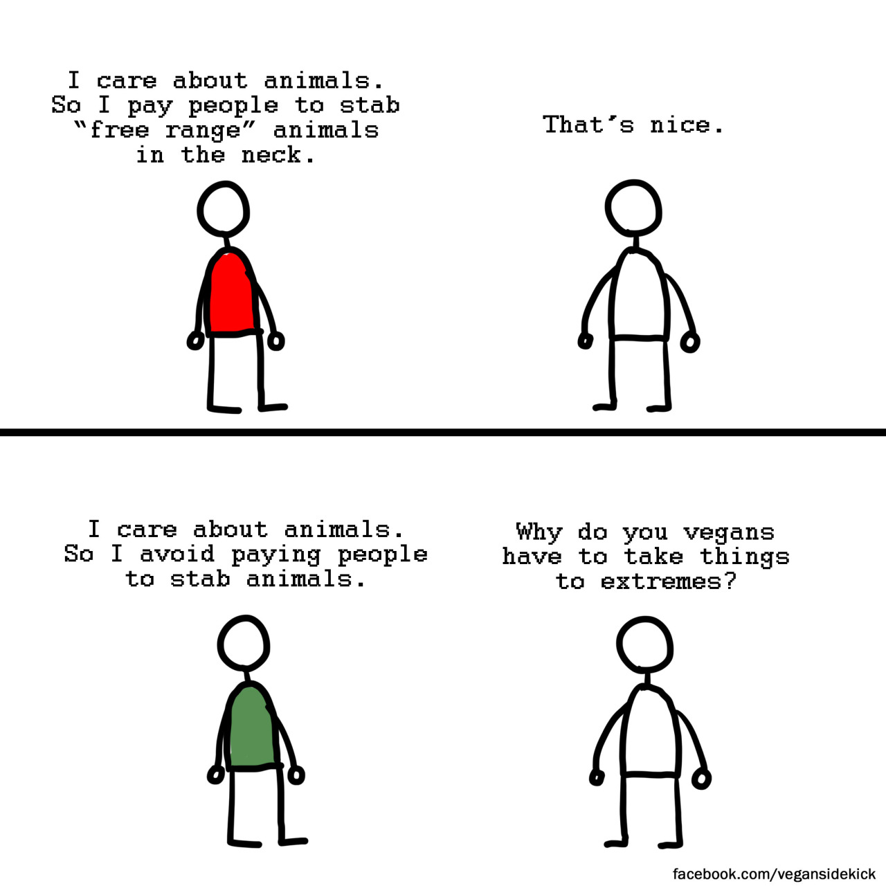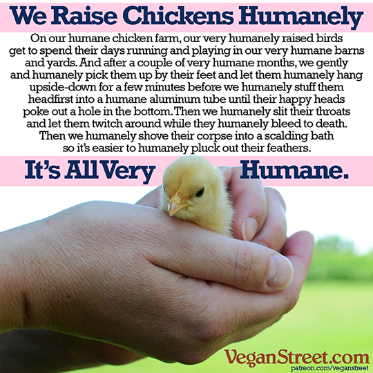 Killing animals for food is far worse than making them suffer. Of course, it is admirable that people care so deeply about these animals that they take deliberate steps to reduce their suffering (e.g. by purchasing "free-range" eggs or "suffering free" meat). However, because they choose not to acknowledge the right of those same animals to live out their natural lives, and because slaughtering them is a much greater violation than mistreatment, people who eat 'humane' meat are laboring under an irreconcilable contradiction.