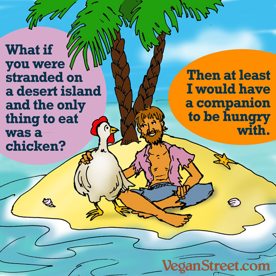 As vegans, we are commonly asked the “deserted island” question. “Sure, you’re vegan, but what if you were stranded on a desert island…what would you eat then?” The simple answer is, “Whatever plants the animals are eating.” To take this a step further, I’d like to pose that those same people answer this question: if a toddler was placed on an uncharted island with abundant wildlife and plant life, would the child grow up a vegan or a meat-eater?